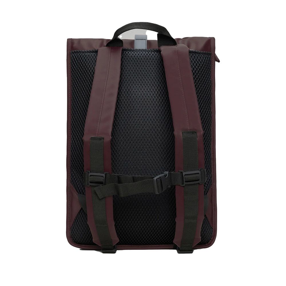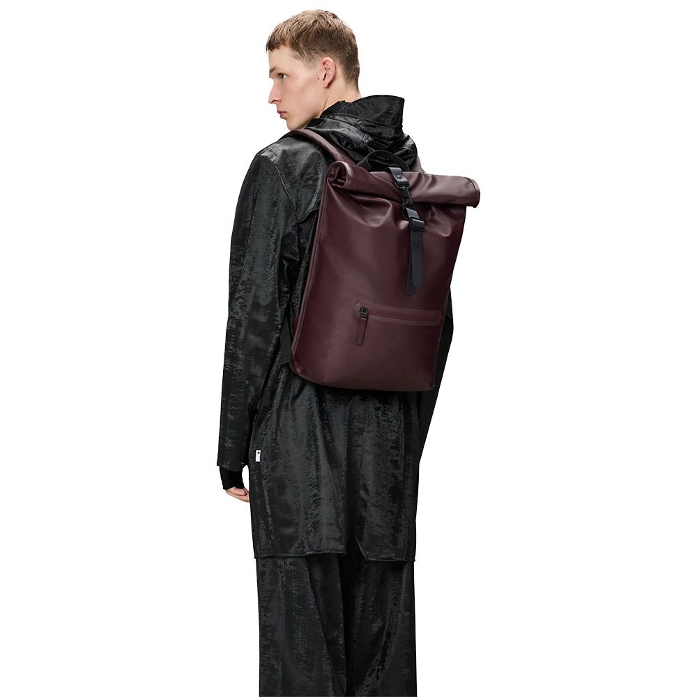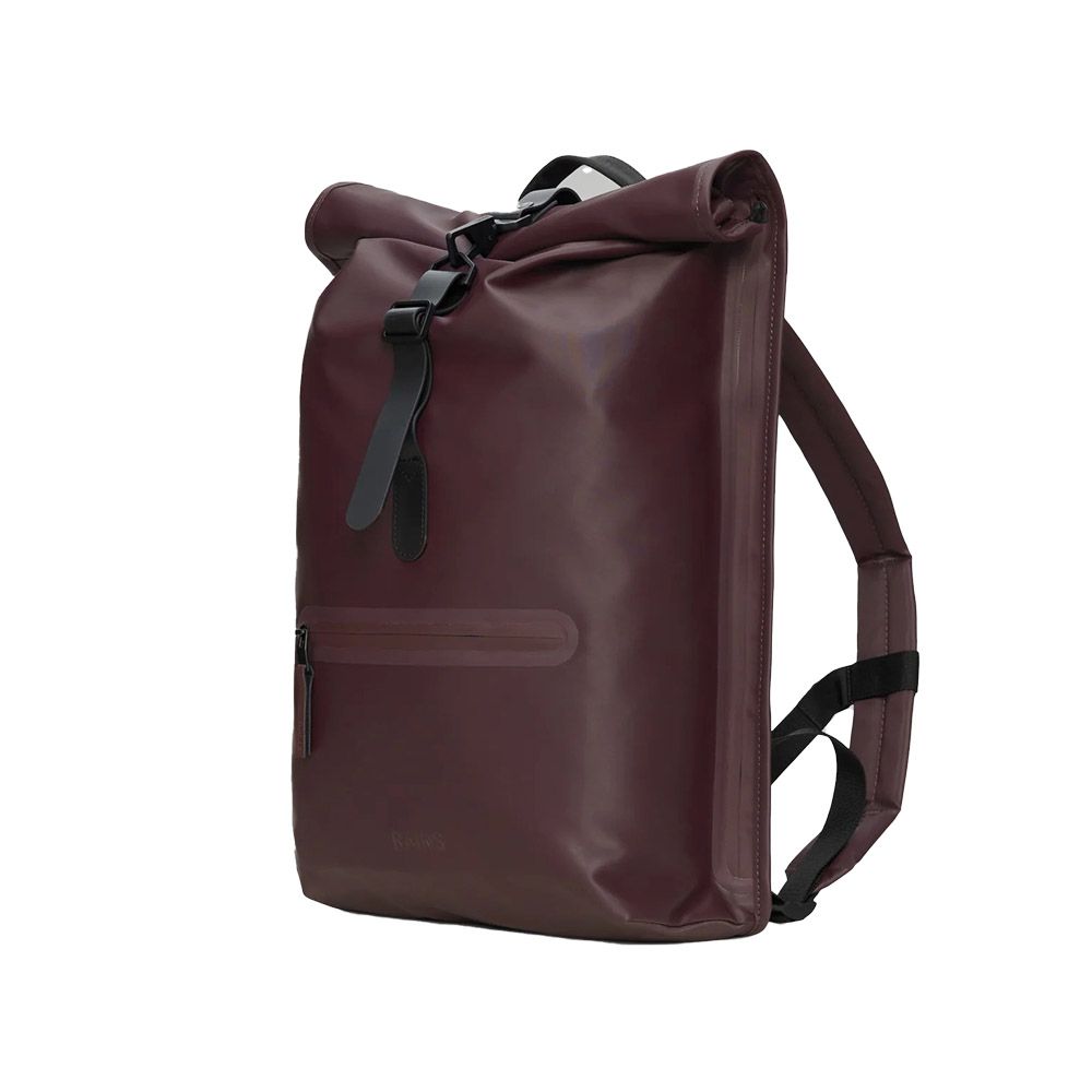 Rains Rolltop Rucksack, zaino costruito in tessuto 100% poliestere con rivestimento PU e impermeabilità testata a 8000 mm di colonne d'acqua. Progettato per uso urbano e spostamenti in bicicletta con caratteristiche specifiche per ciclisti. Capacità di 17 litri con dimensioni 60 x 11 x 32 cm che sviluppano altezza verticale contenendo spessore. Il sistema di apertura rolltop si arrotola e si fissa con il moschettone Rains, bloccando completamente l'ingresso di pioggia dall'alto. Lo scomparto principale singolo offre spazio ampio per oggetti quotidiani. Tasca laterale con accesso dedicato ospita laptop fino a 16 pollici. Tasca frontale con zip rivestita per piccoli oggetti. Anello a D posizionato sul davanti permette aggancio rapido di lucchetti bici. Pannello posteriore imbottito in air-mesh ventilato mantiene circolazione d'aria. Spallacci imbottiti regolabili. Cinghia pettorale regolabile con fibbia stabilizza lo zaino durante la pedalata. Manico superiore in nastro. Peso di 780 grammi.