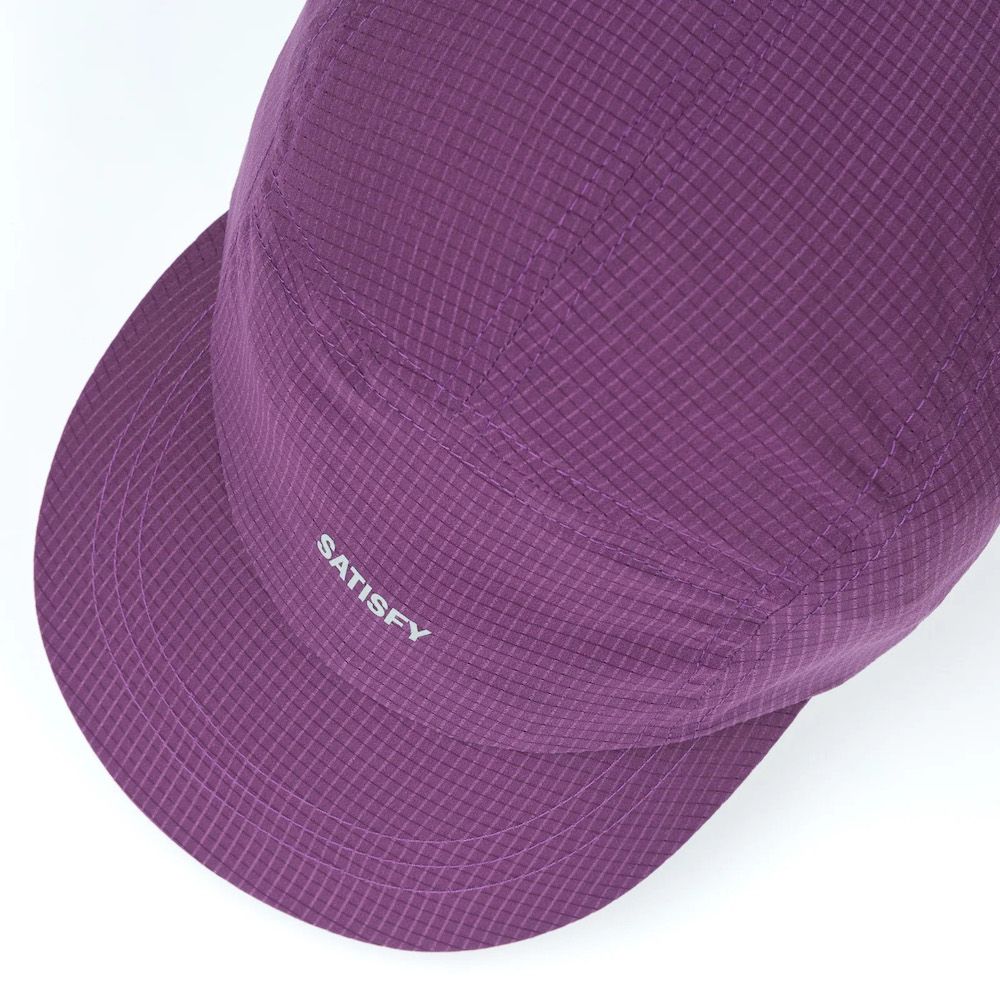 SATISFY Rippy™ Air Trail Cap, cappellino da trail da 24 grammi in Rippy™ Air, ripstop micro-perforato sviluppato in Giappone. Il tessuto è idrorepellente, ad asciugatura rapida e resistente agli odori — una griglia progettata per bilanciare resistenza e ventilazione. La visiera corta non assorbe il sudore, evitando di appesantirsi quando sale il calore. Sistema di regolazione con bungee elastico che si adatta alla falcata e al terreno, stabile in salita, discesa e con il cambio di condizioni. Logo SATISFY riflettente stealth. Etichetta di manutenzione rimovibile all'esterno.