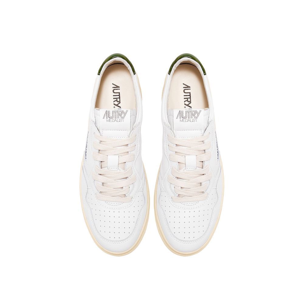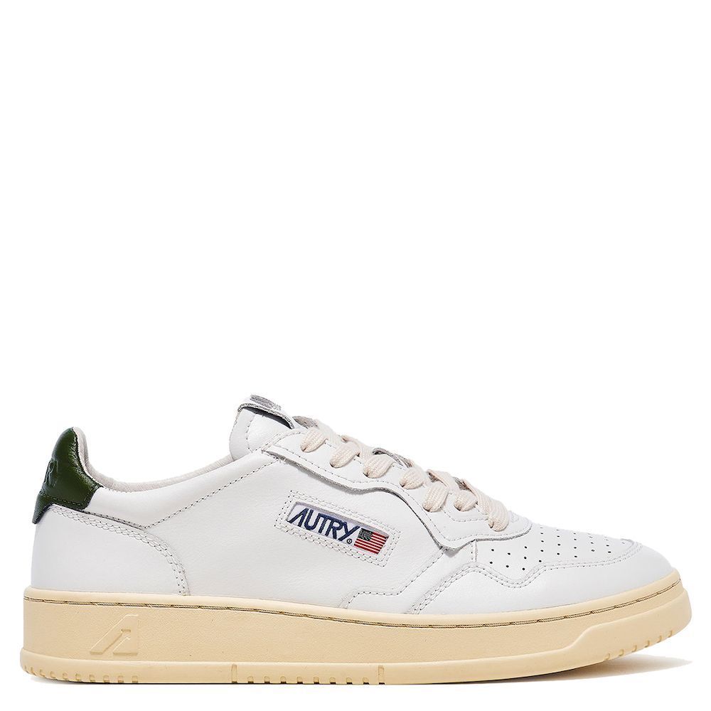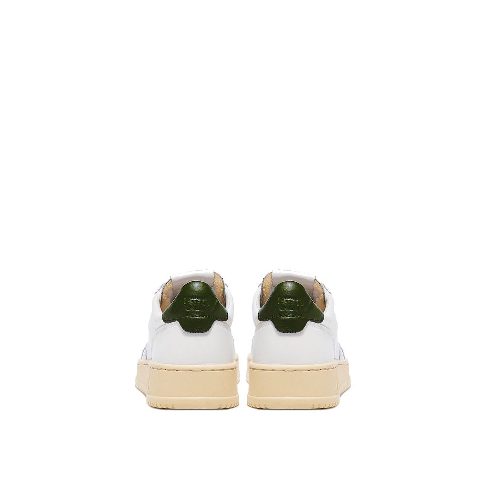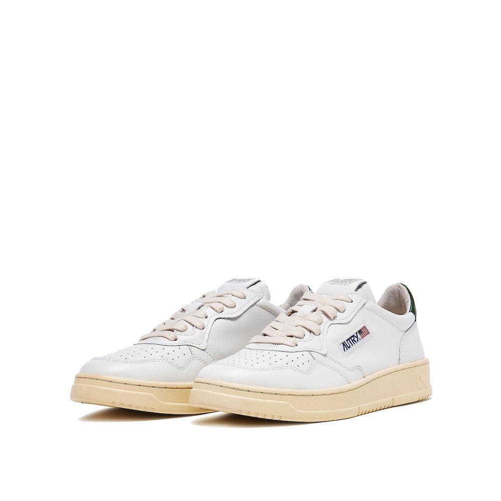Autry Medalist Low Man Leather/Leather – White/Mountain, ispirata al tennis anni '80, questa sneakers unisce linee rétro e materiali di alta qualità. Realizzata in pelle bianca liscia con inserti verde intenso sul tallone e sul lato esterno, si distingue per il suo profilo essenziale e intramontabile. La lavorazione microforata sulla punta migliora la traspirabilità, mentre la suola in gomma assicura sostegno e comfort per tutta la giornata. Perfetta per completare un look casual con una nota autentica.