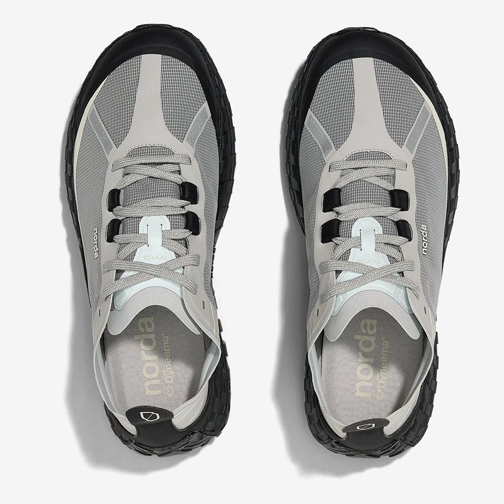 Norda 001A, trail shoe da ultra distanza costruita con i materiali più performanti e leggeri sul mercato. Tomaia seamless in Dyneema® bio-circolare intrecciato — la prima al mondo — che garantisce resistenza all'abrasione e peso minimo. Intersuola in blend proprietario norda™ x Arnitel® TPEE con resilienza e stabilità meccanica eccezionali. Soletta custom in eTPU per massimo assorbimento e restituzione di energia. Suola esclusiva norda™ x Vibram® con tecnologia Litebase® e mescola Megagrip®, tasselli da 5mm. Lacci in Dyneema® bio-based e poliestere riciclato con pattern a diamante. Elementi riflettenti Hi-Vis fronte-retro per visibilità a 360°. Sistema norda Lock con costruzione a soffietto.